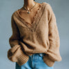 ElevenOra Chic Elegant Brown Deep V-Neck Lace Trim Detail Long Sleeve Oversize Fuzzy Knit Sweater Top