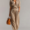ElevenOra Chic Elegant Camel Button-Up Lapel Collar Short-Sleeve Elastic Waist Loose-Fit Wide-Leg Knit Jumpsuit