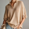 ElevenOra Chic Elegant Camel Lapel V-Neck Short-Sleeve Lace Trim Loose-Fit Knit Sweater Top