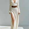 ElevenOra Chic Elegant Cream Deep V-Neck Belted Long Sleeve High Slit Knitted Maxi Dress