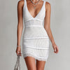 Pair this chic mini dress with elegant high heels or strappy sandals to elevate your look for a night out or a special occasion. Add a statement necklace or a pair of chandelier earrings to complement the deep V-neckline. For a touch of sophistication, consider accessorizing with a clutch bag and a light shawl or bolero.