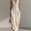 The ElevenOra Chic Elegant Maxi Dress is a timeless piece that beautifully combines elegance and comfort. This cream white sleeveless dress features a sophisticated lapel collar and a button-front design, accentuating its tailored waist and loose-fit silhouette. Crafted from high-quality ribbed knit fabric, it ensures both style and ease, making it a must-have for versatile wear.