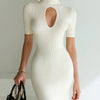 ElevenOra Chic Elegant Cream White Mock Neck Cutout Short-Sleeve Slim-Fit Ribbed Knit Mini Dress
