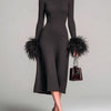 ElevenOra Chic Elegant Dark Brown Turtleneck Slim-Fit Feather Trim Detail Long Sleeve Knit Midi Dress