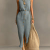 ElevenOra Chic Elegant Haze Blue Round Neck Single-Breasted Sleeveless Loose-Fit Tailored Waist Knit Maxi Dress