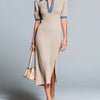 ElevenOra Chic Elegant Light Camel Button-Up Lapel Collar Short-Sleeve Blue Contrast Trim Side-Slit Ribbed Knit Midi Dress
