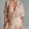 ElevenOra Chic Elegant Light Pink Lapel Collar Short-Sleeve Single-Breasted Loose-Fit Knit Cardigan Shirt