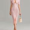 ElevenOra Chic Elegant Pink Lapel Single-Breasted Short-Sleeve Slim-Fit Waffle Knit Midi Dress