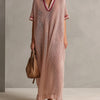 This oversized knit maxi from ElevenOra blends relaxed comfort with refined details. Rendered in a soft pink tone, the dress features a lapel V-neck, short sleeves, contrast trimming along the neckline and edges, and deliberate hollow-out accents that add breathable texture and modern visual interest. The flowing maxi length and loose silhouette create an easy, feminine shape that works for both casual outings and dressed-up occasions.