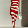 ElevenOra Chic Elegant Red-Beige Striped Crew Neck Sleeveless Loose Vest Front Slit Skirt Ribbed Knit Two-Piece Set