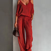 ElevenOra Chic Elegant Red V-Neck Half-Sleeve Cutout Details Loose-Fit Sweater Wide-Leg Pants Knit Two-Piece Set