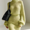 ElevenOra Chic Elegant Turtle Neck Long Lantern Sleeve Sweater Bodycon Mini Skirt Mohair Knit Two-Piece Set