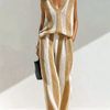 A refined two-piece knit set combining a sleeveless V-neck vest with coordinating wide-leg pants in a timeless white and camel stripe. The lightweight, soft knit drapes effortlessly for a relaxed yet polished silhouette — perfect for transitional weather or dressed-up casual looks. Clean lines and neutral tones create a versatile ensemble that feels both modern and comfortably elegant.