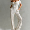 ElevenOra Chic Elegant White Off-The-Shoulder Square Neck Short-Sleeve Gold Button Detail Tailored Waist Wide Leg Crochet Ribbed Knit Jumpsuit