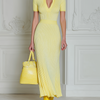 ElevenOra Chic Elegant Yellow Lapel V-Neck Short Sleeve Tailored Waist Knit Maxi Dress