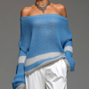 ElevenOra Fashion Casual Blue Off-Shoulder Colorblock Long-Sleeve Loose Knit Sweater