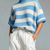 ElevenOra Fashion Casual Blue -White Striped High-Neck Short-Sleeve Knit Sweater Top