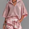 ElevenOra Fashion Casual Pink Lapel Collar Zipper-Front Short-Sleeve Loose-Fit Knit Sweater