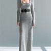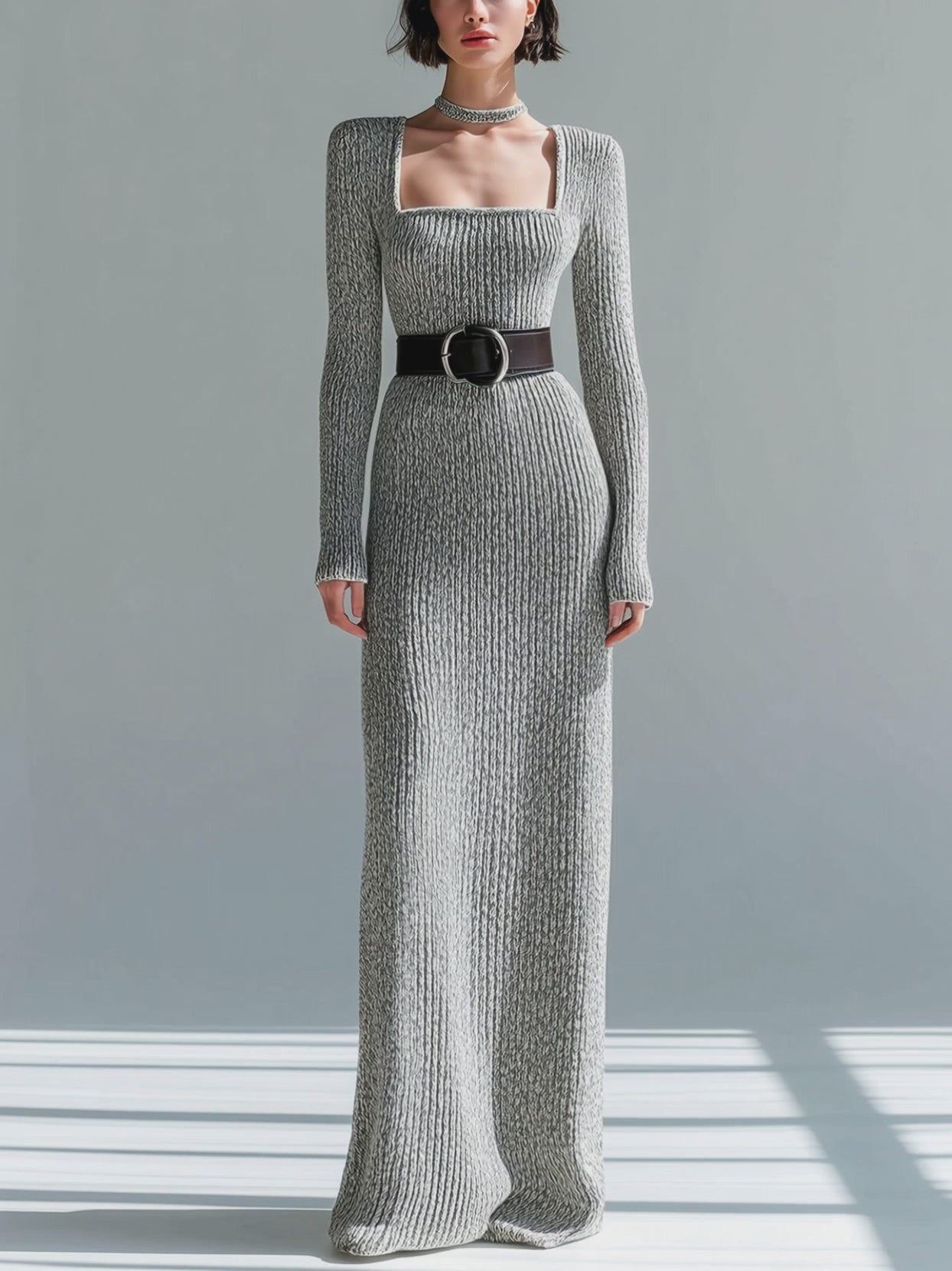 ElevenOra Retro Elegant Heathered Gray Square Neck Belted Long-Sleeve Ribbed Knit Bodycon Maxi Dress
