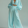 A refined two-piece ensemble in a soft mint green — this set pairs a V-neck, long-sleeved loose-fitting chiffon top with matching wide-leg chiffon pants. The lightweight fabric creates graceful movement and an airy silhouette, making the set comfortable for warm-weather days or layered styling in transitional seasons. Designed for effortless elegance, it balances relaxed comfort with a polished look.
