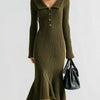 ElevenOra Stylish Button-up Lapel Collar Long Sleeves Knit Flounce Hem Midi Dress