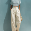 White wide-leg pants with a smooth, streamlined silhouette to balance volume and create an elongated look.