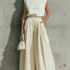 ElevenOra Stylish Elegant White Turtleneck Sleeveless Loose-Fit Knit Vest Top Beige High-Waist Wide-Leg Pants Teo-Piece Set