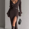 ElevenOra Stylish Solid Color Deep V-Neck Belted Slim Fit Long Sleeve Knit Slit Hem Midi Dress