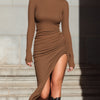 ElevenOra Stylish Solid Color Round Neck Long Sleeve Slim Fit Knit Shirred Side Slit Midi Dress